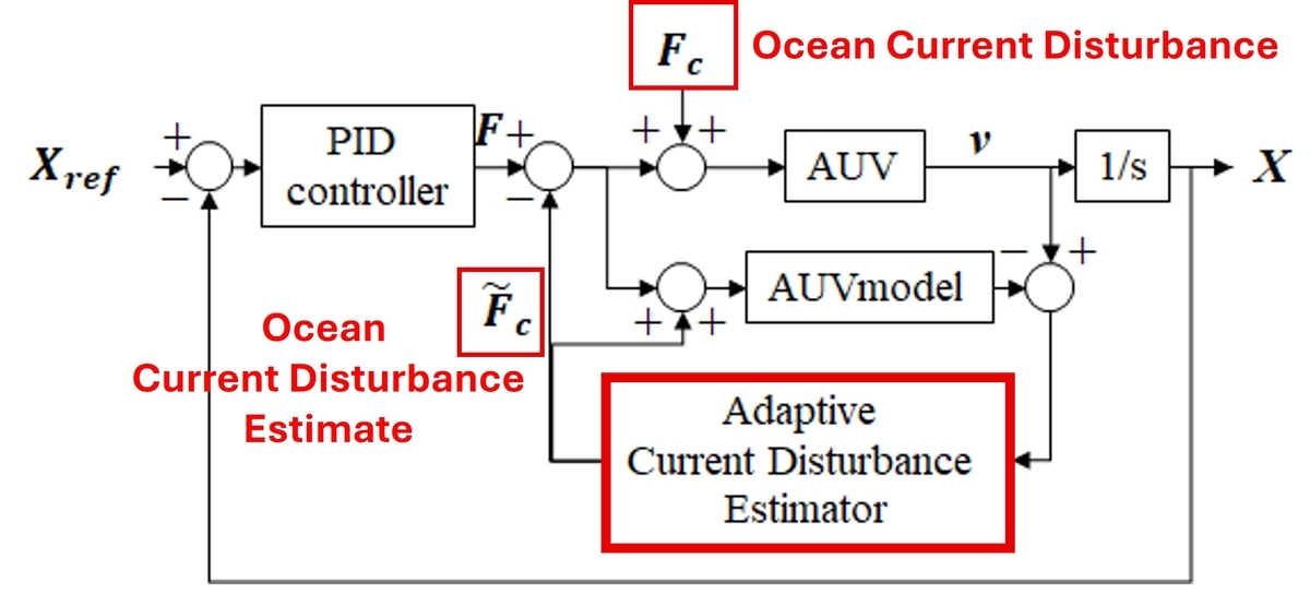The position control of the underwater drone is based on the difference between the target values (latitude, longitude, bearing, and underwater altitude in four directions) and the drone's current position and orientation information, performing independent PID control [*7] for each of the four directions. Particularly for the latitude and longitude directions, we estimate the ocean current disturbance from the difference between the drone's actual velocity and its model velocity and add this to the control system in advance, effectively reducing the impact of ocean currents (see Figure 3).