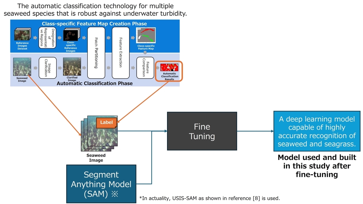 Specifically, we apply enhancement processing to images taken at a close range of within 0.5m from the seaweed and seagrass, and from these clear images, we create class-specific feature maps that serve as the basis for automatic classification for each seaweed and seagrass species. By comparing and classifying these class-specific feature maps with the captured images and fine-tuning the Segment Anything Model [*8], we have constructed a deep learning model capable of recognizing coverage with high accuracy (see Figure 5).